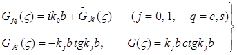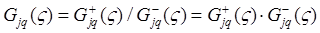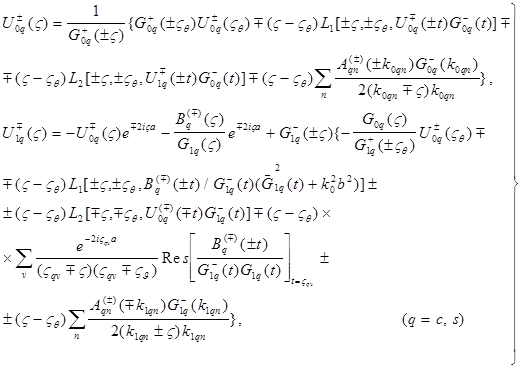 Что касается системы уравнений Винера-Хопфа, представленной формулой (24), то ее решение можно найти, выполняя интегрирование вдоль разрезов от точек ветвления в разложениях керн-функций на множители. При выполнении расчетов возникают определенные затруднения, однако вывод решений проводится автоматически. Сначала выполняем разложение керн-функций на частное (произведение) функций, регулярных в верхней полуплоскости и в нижней полуплоскости, и, сверх того, не имеющих нулей (j =0, 1, q = c , s ):