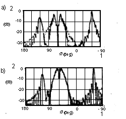 b) - результаты расчетов (идеальный проводник); 1 - Æ (град.); 2 - (дБ).