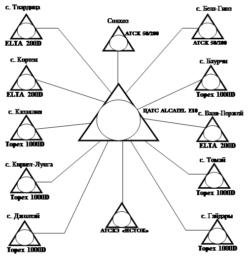 Сеть связи Чадыр-Лунгского района за последние годы также претерпела существенные изменения за счет большого объема работ по модернизации оборудования и сетей. Структура существующей сети связи показана на рисунке 1.1 и как из него видно является довольно неоднородной в плане применяемого коммутационного оборудования.