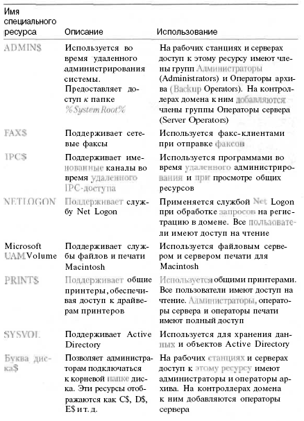 Управление специальными ресурсами. ОС автоматически создает специальные ресурсы. Их также называют административными (administrative) и скрытыми (hidden). Эти ресурсы облегчают системное администрирование. Невозможно настроить разрешения доступа к автоматически создаваемым специальным ресурсам — ОС назначает их сама. Но эти ресурсы можно удалить, если какие-то из них не нужны.