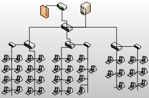 Передача и обмен данными в сети между рабочими станциями производится с помощью коммутаторов(switch), а обработка данных должна производиться рабочими станциями. В данной сети используется топология «иерархическая звезда». К главному серверу подключен коммутатор, который связан с другими коммутаторами, расположенные на этажах и отделах, и к ним подключены по отдельности рабочие компьютеры.