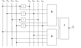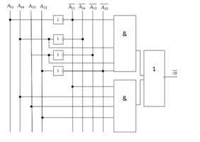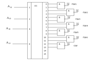 В качестве анализа четырех старших разрядов шины адреса можно использовать дешифратор двоично-десятичный, который получив двоичный код на входе активирует выход с соответствующим номером. Выходы дешифратора для каждой микросхемы объединяем функцией И.