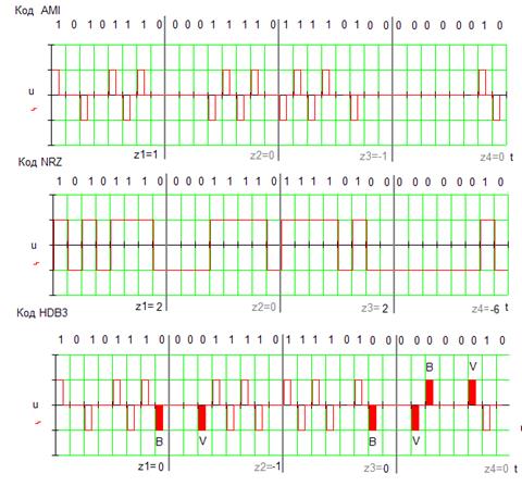 HDB-3: соответствует формированию кода AMI, но пакеты из четырех нулей заменяются комбинацией вида 000V и B00V,в которых импульс B не нарушает полярностей, а импульс V-нарушает, то есть его полярность совпадает с полярностью предыдущего импульса.