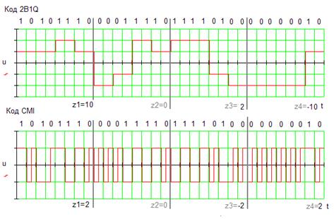 CMI: "1" передаются импульсами чередующейся полярности длительностью в тактовый интервал, "0" передаются биимпульсами