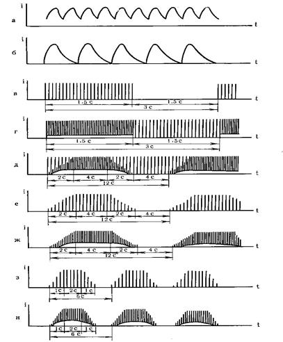 Рисунок 3 – Токи ДДТ,. а – однонаправленный непрерывный (100 Гц); б – двунаправленный непрерывный (50 Гц); в – однонаправленный ритмичный; г – короткий периодичный; д – длинный период; е – однополупериодный волновой; ж – двухполупериодный волновой.