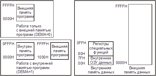Все ОМЭВМ рассматриваемого семейства имеют несколько адресных пространств, функционально и логически разделенных за счет разницы в механизмах адресации и сигналах управления записью и чтением: память программ; внутренняя память данных; внешняя память данных.