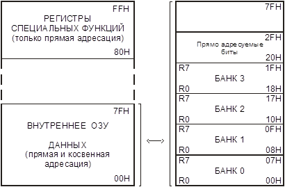 Внутренняя память данных ОМЭВМ состоит из двух областей: 128 байт оперативной памяти (ОЗУ) с адресами 0-7FH и области регистров специальных функций, занимающей адреса 80Н–FFH. Распределение пространства внутренней памяти данных показано на рис. 3. Физически внутреннее ОЗУ данных и область регистров специальных функций являются отдельными устройствами.
