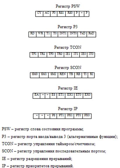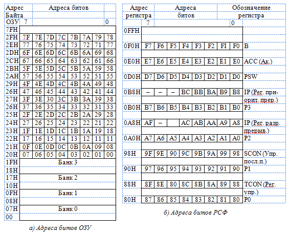 Следующие после банков регистров внутреннего ОЗУ данных 16 байт (адреса 20Н–2FH) образуют область ячеек, к которым возможна побитовая адресация. Набор команд ОМЭВМ семейства MCS-51 содержит значительное количество инструкций, позволяющих работать с отдельными битами, используя при этом прямую адресацию. 128 бит, составляющих рассматриваемую область внутреннего ОЗУ данных, имеют адреса 00Н–7FH и предназначены для работы с такими инструкциями.