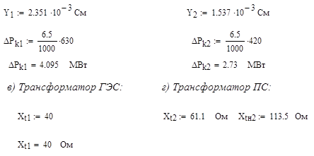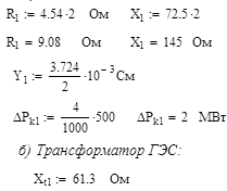 ΔРк = 0,325 МВт, ΔРх = 0,125 МВт, Хт н = 113,5 Ом, Хт в = 61,1 Ом.