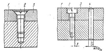 Для соединения, выполняемого при помощи «цилиндрических» винтов, предусматривают штифтование сопрягаемых деталей штифтом 4, что исключает взаимное перемещение деталей / и 3 в процессе эксплуатации изделия. Отверстие под штифт сверлят в детали 1 по имеющемуся отверстию в детали 3 после сборки. Перед установкой штифта на место отверстия в деталях 1 и 3 совместно обрабатывают разверткой.