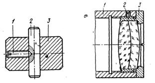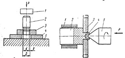 Соединение деталей развальцовкой осуществляют путем раскатки кромки одной детали и плотного прижатия этой кромки к поверхности другой детали. На рис.9. показан процесс соединения, выполняемого этим способом. Здесь зубчатое колесо 3 насаживается на посадочный диаметр оси 2, которая закреплена в зажимном устройстве 1.