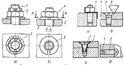 Предохранение винтовых соединений от саморазвинчивания с помощью разводных шплинтов (рис. 5, а) осуществляется путем установки шплинта 2 в отверстия гайки 3 и винта (болта) 1 с последующим разведением концов шплинта относительно друг друга. Отверстия под шплинт 2 сверлят при сборке узла или прибора.