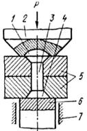 Технологический процесс соединения заклепкой ведется в следующей последовательности: фиксация и крепление склепываемых деталей 5 по чертежу;