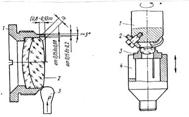 Металлическую оправу 1 устанавливают в цанговый (зажимной или разжимной) патрон или резьбовую оправу станка и сообщают ей вращение. При завальцовке вручную применяют специальный инструмент - полировальник (или воронило) 3, которым закатывают кромку оправы на фаску оптической детали 2. Полировальник опирают на подручник станка.