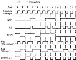 Кожному біту даних ставиться у відповідність визначений період сигналу, що контролюється таймером. Таймером служить постійний ланцюжок імпульсів, що задає часовий інтервал для основної системи. Як показано у таблиці 5.1, деякі коди мають внутрішні сигнали синхронізації, інші не мають. Код із внутрішньою синхронізацією являє собою код із уже включеною інформацією про час. В інших кодах ця інформація відсутня.