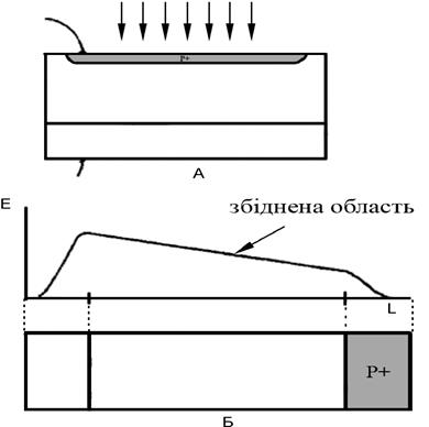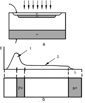 -типу. Ця структура представлена на рис. 5.Розподіл електричного поля в залежності від довжини діоду представлені на рис. 5. Збіднена зона зроблена максимально широкою. Слаболегований проміжний шар розділяє більш сильно леговані шари n- і р- типу. Проміжний шар легований у таким, що не відноситься ні до напівпровідників