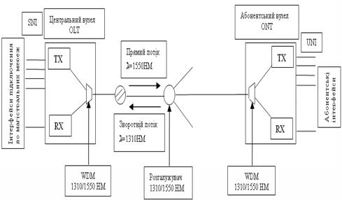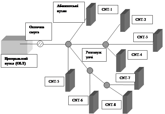 Структурно пасивна оптична мережа складається із трьох елементів: центрального вузла (OLT), пасивних оптичних розгалужувачів (мережевих вузлів) і абонентських вузлів (ONT) (рис. 1).