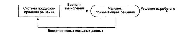 Главной особенностью информационной технологии поддержки принятия решений является качественно новый метод организации взаимодействия человека и компьютера. Выработка решения, что является основной целью этой технологии, происходит в результате итерационного процесса (рис. 5), в котором участвуют: