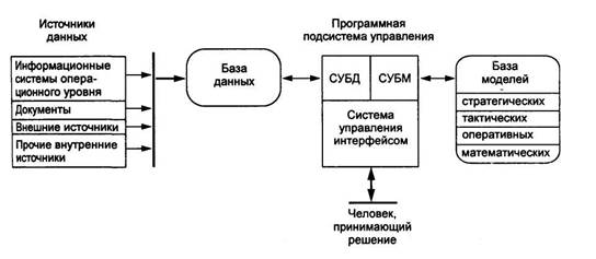В состав системы поддержки принятия решений входят три главных компонента: база данных, база моделей и программная подсистема, которая состоит из системы управления базой данных (СУБД), системы управления базой моделей (СУБМ) и системы управления интерфейсом между пользователем и компьютером (рис.6).