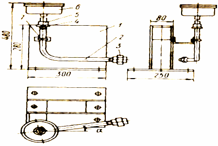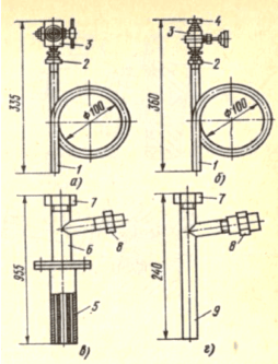 Для установки ГВМ застосовують нормалізовані конструкції (Рис. 8.1), що складаються з підставки 1 і закріпленої на ній труби 2 із зливною воронкою 6 . Приєднання труби до дренажного трубопроводу виконано накидною сполучною гайкою 3 , а до зливної воронки—муфтой 5 і контргайкою 4 . Кут α визначають залежно від розташування дренажного трубопроводу на місці монтажу. Під час монтажу звертають увагу на стан регулюючого органу, зчленованого з виконавчим механізмом. Регулюючий орган повинен бути урівноважений і легко переміщатися. Якщо для перестановки потрібні значні зусилля, проводять ревізію і усувають причини його неправильної роботи. Конструкція зчленовування гідравлічного виконавчого механізму з регулюючим органом повинна передбачати використовування повного ходу поршня сервомотора механізму при повному ходу регулюючого органу.