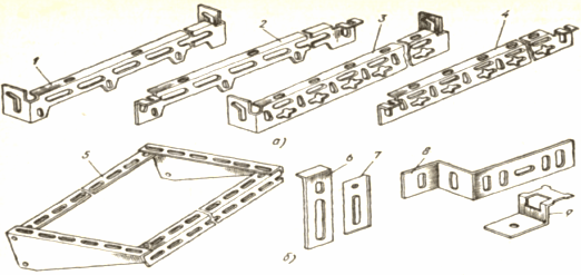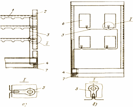 Мал. 160. Приклади електричного з'єднання металевих деталей з каркасом щитової конструкції (а ) і занулення (заземлення) приладів і апаратів, що мають спеціальний висновок «Земля» (б ): 1 — косинець, 2 — стійка щита, статива, 3 — гнучкий нерозрізаний провідник, 4, 7 — заземляющие затиски М6 і М8, 5 — наконечник, 6 — прилад