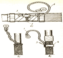 Екрануючі оплетки кабелю або дроту (Рис.7.3, б )зануляют перед місцем їх кріплення у збірки затисків або у введення в прилад або апарат. На відстані 10—15 мм від цього місця на екрануючу оплетку накладають бандаж з 6 — 7 витків мідного дроту діаметром 0,4 — 0,5 мм.
