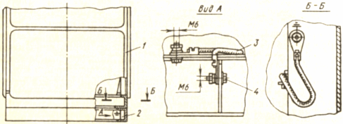 Рис.7.4. Електричне з'єднання каркаса щитової конструкції з її опорною рамою: 1 — каркас, 2 — опорна рама, 3 — гнучкий провідник, 4 — затиск заземлення