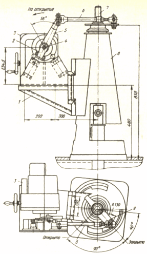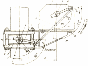 Електричні виконавчі механізми встановлюють підставою або бічною стінкою на кронштейні або якій-небудь іншій конструкції. При цьому вісь вихідного валу виконавчого механізму повинна займати горизонтальне положення. Вихідний вал виконавчого механізму зчленовують з валом регулюючого органу кривошипом і жорсткою тягою. Вузли зчленовування виконавчого механізму з регулюючим органом не повинні мати люфтів. Корпуси електричних виконавчих механізмів заземляють за допомогою дроту перетином з площею не менше 4 мм2 через спеціальний болт, передбачений на механізмі. На Рис.8.2 показана установка електричного виконавчого механізму типу МЕО, керівника поворотним регулюючим шибером. Шибер розташований вертикально в димарі нагрівальної печі і є регулюючим органом в схемі автоматичного регулювання тиску в печі. Виконавчий механізм 3 встановлюють на кронштейні 1 , який прикріплений безпосередньо до корпусу 8 колонки регулюючого шибера. Важіль 5 виконавчого механізму шарніра зчленований із сполучною тягою 6 , інший кінець якої також шарнірно зчленований з важелем 9 поворотного шибера. Переміщення важеля 5 по або проти годинникової стрілки обмежується кінцевими вимикачами. Упор 2, що переміщається одночасно з важелем 5 , впливає на кінцеві вимикачі так, що виконавчий механізм переміщає поворотний шибер в межах 90° від крайнього положення «Закрито».