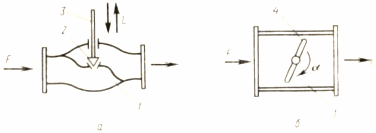 Рис.10.1. Схеми регулюючих органів: а — односідельного; б — засліночного; 1 — корпус; 2 — затвор; 3 — шток;