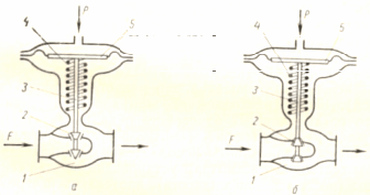 Рис.10.2. Схеми пневматичних регулюючих клапанів: а -нормально відкритого (НО); б - нормально закритого (Н3) 1 – корпус; 2 – затвор; 3 — шток; 4 — пружина; 5 — мембрана.