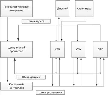 Общий принцип функционирования микропроцессорного устройства заключается в следующем. Из микропроцессора на шину адреса выдается адрес очередной команды. Считанная по этому адресу из памяти (например, из ПЗУ) команда поступает на шину данных и принимается в микропроцессор, где она и исполняется. В счетчике команд микропроцессора формируется адрес следующей команды. После окончания исполнения данной команды на шину адреса поступает адрес следующей команды и т. д.