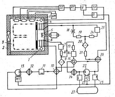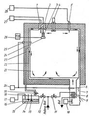 Повітря, що циркулює муж стінками камери, нагрівається нагрівачем 7 . Для охолодження повітря (при перевищенні заданої температури) слугують заслінка 9 і змійовик 8 , через який при відкриванні соленоїдного вентиля 11 попускається вода. Подавання напруги на нагрівач, соленоїдний вентиль і електромагніт, що керує заслінкою, виконується електронним мостом 20 через виконавчі реле і контактори. Контроль і безперервний запис температури в камері виконується електронним мостом 28 , датчиком температури для якого є платиновий термометр опору 5 . За його показниками вмикаються світлова і звукова сигналізація при перевищенні заданої температури, наприклад, у випадку безперервності системи управління нагрівачами або охолодженням.