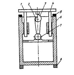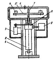 1 – кожух; 2 – колектор; 3 - електродвигун; 4 – затискний пристрій; 5 – стіл; 6 – кришка; 7 – вал; 8 – барабан; 9 – електромагніт.