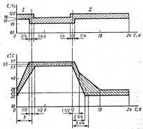 год – час, в продовж якого не допускається конденсація вологи в виробах; I – кінець підйому температури; II – початок падіння температури