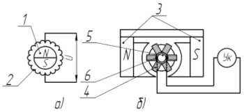Электрические тахометры постоянного тока (рисунок 5) включают тахогенератор постоянного тока и гальванометр. Тахогенераторы бывают двух типов: с ограниченным (рисунок 5 а) и неограниченным (рисунок 5 б) углом поворота ротора.