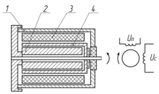 Тахогенератор с ограниченным углом поворота выполняется с неподвижной статорной обмоткой 2, внутри которой помещается постоянный магнит 1, связанный с валом, скорость вращения которого контролируется. Наводимая в статорной обмотке ЭДС равна
