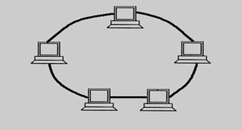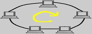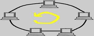 На рисунке уже изображена топология сети кольцо. Т.е. теперь у нас каждый персональный компьютер подсоединен к соседним компьютерам. И, соответственно, в топологии сети кольцо передавать данные он может только переднему соседу, а получать только от заднего соседа. Этим мы экономим общую рабочую силу, так как в сети при приеме и при передаче работает только один приемник и один передатчик.