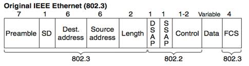 · Данные (LLC Data): поле данных, которое обрабатывается подуровнем LLC. Сам по себе кадр IEEE 802.3 еще не окончательный. В зависимости от значений первых нескольких байт этого поля, могут быть три окончательных формата этого кадра IEEE 802.3: