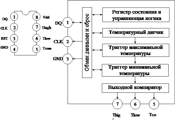 Передача данных от микросхемы к внешнему устройству осуществляется по трехпроводной последовательной шине: СLK/СОNV (контакт 2), DQ (контакт 1) и RЕSЕТ (контакт 3). Эти выходы совместимы с уровнями ТТЛ. Тhigt (контакт 7) – выход триггера высокой температуры. Если температура превышает установленный верхний порог, то выход Тhigt сигнализирует об этом высоким уровнем и остается в таком состоянии до тех пор, пока температура не упадет ниже заданного порога. Тlow (контакт 6) – выход триггера низкой температуры. Если температура опускается ниже определенного нижнего предела, то на нем появляется сигнал высокого уровня, сохраняющийся до тех пор, пока температура не поднимется выше указанного предела. Тсоm (контакт 5) – это выход комбинированного триггера высокой и низкой температуры. Тсоm=1, когда температура превышает верхний предел, Тсоm=0, когда она опускается ниже нижнего предела. Контакты 4 и 8 соединены с отрицательным и положительным проводами источника питания. Потребляемый ток в режиме ожидания равен 1 мкА, в рабочем режиме - 1 мА.