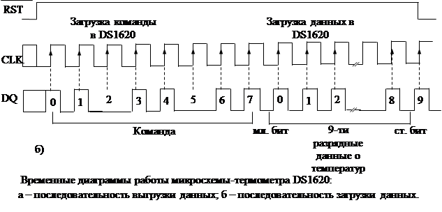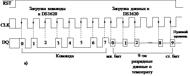 Временные диаграммы передачи данных представлены на рис 2. Передача начинается при поступлении положительного фронта на вход RST (контакт 3). Если на этот вход подать 0, то передача прекращается. Процессами чтения и записи управляет тактирующий вход микросхемы. Один тактовый цикл состоит из отрицательного фронта и следующего за ним положительного. При записи информации состояние битов данных должно оставаться неизменным во время прохождения положительного фронта. При считывании данные выводятся из устройства по каждому отрицательному фронту тактовых импульсов. Когда на тактовом входе высокий уровень, выход DQ (контакт 1) имеет высокое сопротивление. При чтении данных младший бит передается первым. Через этот контакт можно как принимать, так и передавать данные. Схема с использованием термометра DS1620, подключенного к экспериментальной плате параллельного порта, приведена на рис. 3.