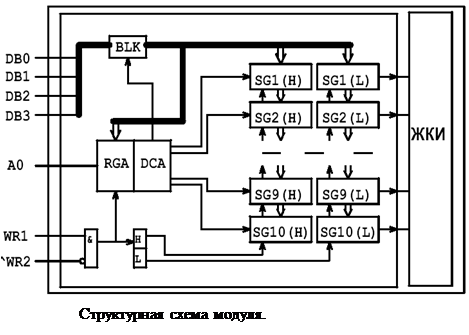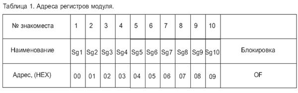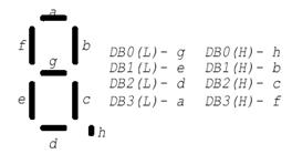 Регистры данных в БИС делятся на две тетрады: SGx(L) и SGx(H). Запись данных в знакоместо производится за два такта: сначала в младшую тетраду, затем в старшую. Младшая тетрада отвечает за сегменты g, e, d, a, а старшая – за сегменты h, b, c, d. (см. рис.).