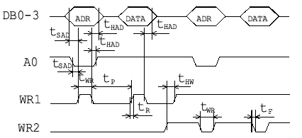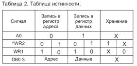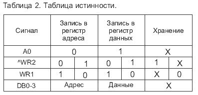 Сначала на шине выставляется адрес необходимого знакоместа, который фиксируется в регистре адреса при низком уровне на входе WRx (см.таблицу). Входы WR1 и ^WR2 защелкивают информацию, стоящую на шине, во внутренних регистрах статического типа. Внутри БИС эти входы объединены по схеме WR1 & ^WR2. Таким образом, информация запишется только при WR1 = “H” и ^WR2 = “L” одновременно. Такое решение осуществить функцию CS (выбор кристалла) при большом количестве модулей на шине, или если на шине имеются другие устройства.
