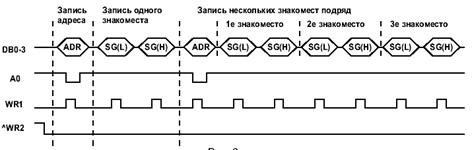 При записи адреса знакоместа указатель тетрады сбрасывается в положение SGx(L). Запись данных производится в младшую тетраду при высоком уровне сигнала на входе А0 сигналом WRx. По этому же сигналу указатель тетрады данных переключается в положение SGx(H), сохраняя при этом тот же адрес знакоместа. Данные в старшую тетраду SGx(H) записываются аналогично младшей тетраде SGx(L). После записи второй тетрады содержимое регистра адрема инкрементируется и можно записывать данные в следующее знакоместо без записи адреса.