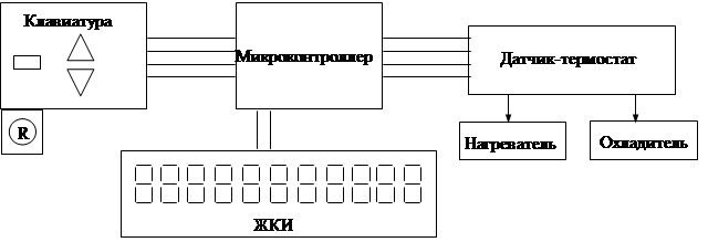 Наша задача состоит в поддержании температуры в заданном диапазоне значений. Коридор значений температуры задается оператором с клавиатуры. На ЖКИ необходимо выводить данные о текущей температуре, о верхнем пределе и о нижнем пределе (поочередно, в зависимости от выбранного оператором режима). Температурный датчик должен сообщать о нахождении температуры в заданном коридоре свечением светодиода на одном из своих выводов (Tcom). Также цифровой термостат будет осуществлять управление исполнительными устройствами (нагревателем и охладителем) подачей сигнала высокого уровня на соответствующие выводы (Thigh и Tlow). Одновременно включенными оба исполнительных механизма быть не должны. Задачи по управлению термостатом, по выводу информации на ЖКИ, по обработке информации с термостата и с клавиатуры оператора возлагаются на микроконтроллер.