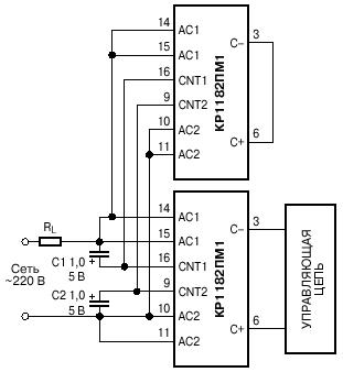 Допускаемая мощность увеличивается пропорционально количеству микросхем. При этом количество элементов управления остается прежним. Элементы управления подключаются к одной из микросхем, остальные же микросхемы соединяются между собой выводами силовых тиристоров 14, 15 (АС1) и 10, 11 (АС2), закорачиваются входы управления С – (вывод 3) и С+ (вывод 6) каждой микросхемы, кроме основной.