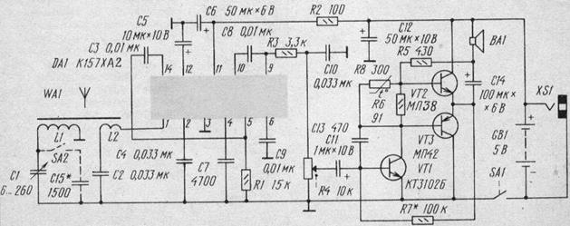 Выделенный контуром сигнал поступает через катушку связи L2 на входной вывод 1 микросхемы DA1. Он связан со входом двухкаскадного усилителя РЧ, расположенного в корпусе микросхемы. Далее усиленный сигнал подается через конденсатор С3 на последующие каскады усиления РЧ, после чего детектируется. Выделенный детектором сигнал ЗЧ предварительно усиливается, а затем с вывода 9 микросхемы подается через фильтр R3C10 на регулятор громкости – переменный резистор R4, а с его движка – на усилитель мощности. Предварительный каскад усилителя мощности выполнен на транзисторе VT1, а двухтактный оконечный – на транзисторах VT2, VT3. Между каскадами введена обратная связь через резистор R7, которая поддерживает нужное рабочее напряжение на выходе усилителя и снижает нелинейные искажения. Конденсатор С13 предотвращает самовозбуждение каскада на транзисторе VT1, терморезистор R8 стабилизирует режим работы выходного каскада при изменении температуры окружающей среды. Нагрузкой усилителя является динамическая головка ВА1.