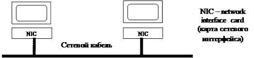 Самая простая сеть (network) состоит из нескольких ПК, соединенных между собой сетевым кабелем (рис. 1.1). При этом в каждом ПК устанавливается специальная плата сетевого адаптера (NIC), осуществляющая связь между системной шиной компьютера и сетевым кабелем.