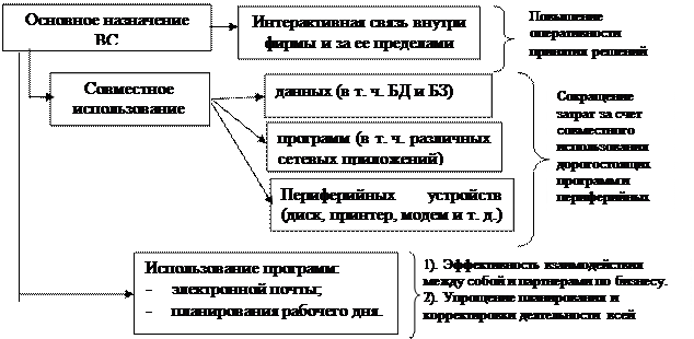 Другой привлекательной стороной сети является наличие программ электронной почты и планирования рабочего дня. Благодаря им, сотрудники эффективно взаимодействуют между собой и партнерами по бизнесу, а планирование и корректировка деятельности всей компании осуществляется значительно проще. Использование компьютерных сетей позволяет: а) повысить эффективность работы персонала фирмы; б) снизить затраты за счет совместного использования данных, дорогостоящих ПУ и программных средств (приложений).