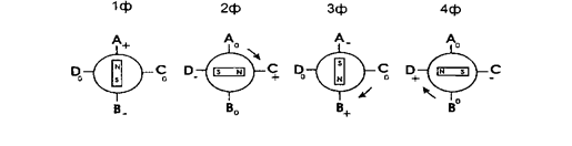 Для вращения в противоположном направлении (синхронизация прежняя) изменяется порядок возбуждения обмоток, на противоположный. Как показано на диаграммах, угол поворота ротора составляет 90°. Промышленные двигатели имеют больше полюсов и достигают угла поворота в несколько градусов, но число обмоток и последовательность привода остаются неизменными.