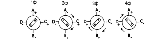• Возбуждение обмоток происходит в последовательности AB/CD/ BA/DC (ВА указывает на то, что обмотка АВ возбуждается в противоположном направлении). Эта последовательность известна под названием «одна фаза активна», «полный шаг» или «привод волны». В каждый момент возбуждается только одна из фаз (рис. 1.5).